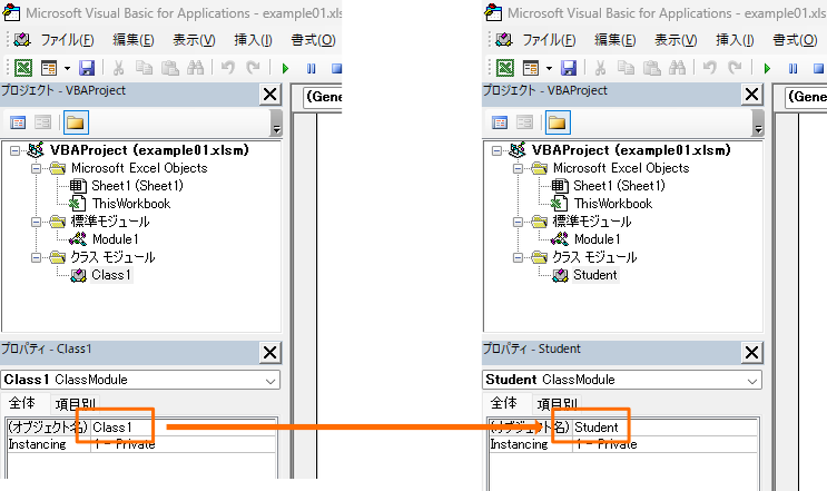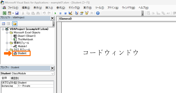 - ③プロジェクトブラウザのクラスモジュール配下の「Student」をクリックし、コードウィンドウを表示する